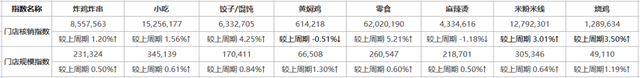 其中生煎/鍋貼/小籠類目、黃燜雞類目、燒雞類目門店規(guī)模指數(shù)上漲明顯,分別上漲2.72%、1.30%、1.19%