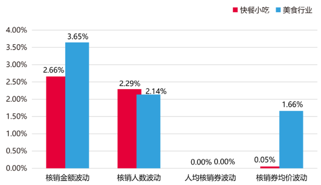 其中零食類目、餃子/餛飩類目、燒雞類目門店核銷指數(shù)上漲明顯,分別上漲5.21%、4.25%、3.50%