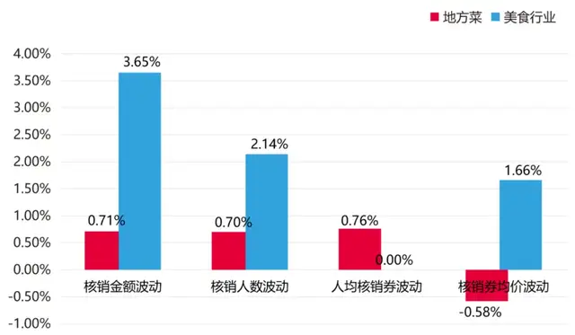 12月第二周地方菜類目門店核銷指數(shù)較第一周上漲0.71%,門店規(guī)模指數(shù)較第一周上漲0.55%