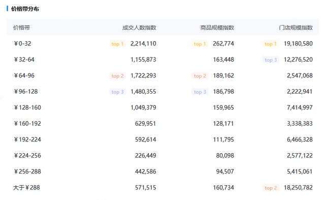其中大于¥288價格帶、¥32-64價格帶、¥128-160價格帶商品規(guī)模指數(shù)上漲明顯,分別上漲3.54%、2.77%、2.43%
