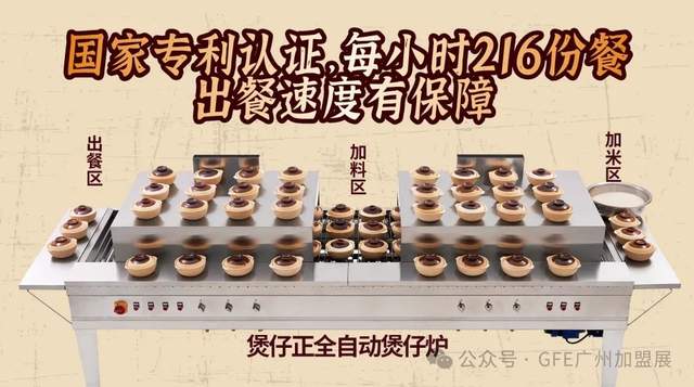 第二,連鎖擴展:做大做連鎖,關鍵是解決效率問題。煲仔飯的痛點是出餐慢,對師傅制作手藝要求高,煲仔正的秘密就靠一臺專利設備——全自動流水線煲仔爐,國家專利認證,一小時出216份餐,相當于2-3人每1分鐘就能出餐3.6個。只需4-6人即可經營60㎡門店。既解決用人成本問題,也解決出餐慢的效率,還將出餐標準做到千店一味。