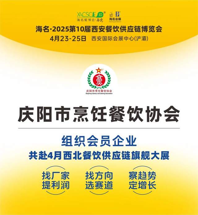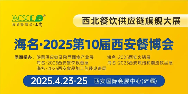 海名·2025第10屆西安餐飲供應鏈博覽會(以下簡稱:海名·2025西安餐博會),將于2025年4月23日-25日在西安國際會展中心(浐灞)舉辦。本屆博覽會由海名國際會展集團主辦,西安海名會展有限公司、鄭州海名匯博會展策劃有限公司、成都海名會展有限公司、中國陜菜網共同承辦。本屆博覽會全面煥新升級,緊密貼合市場需求,聚焦細分品類,對展會主題進行精準定位與全新詮釋,整合全行業資源,共創共建,共生共榮,搭建行業大平臺,匯聚行業新勢力!博覽會由五大主題展15大品類、1場大會、4場專題活動、1場行業賽事、1場春季流行菜發布會構成,促進行業上下游產業鏈緊密聯系,搭建廣闊的交流平臺,、多視角地推動產業變革與新生,助力西北地區餐飲企業與全國市場接軌,為西北餐飲產業的繁榮發展注入源源不斷的創新活力。