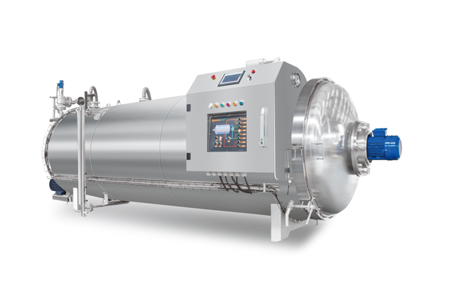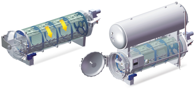 金鼎旋轉式殺菌釜工作過程中,產品在殺菌釜內做360°旋轉,可使產品在殺菌過程中充分混合搖勻,不分層,防止表層產品熱損傷,有效提高產品熱穿透速度。