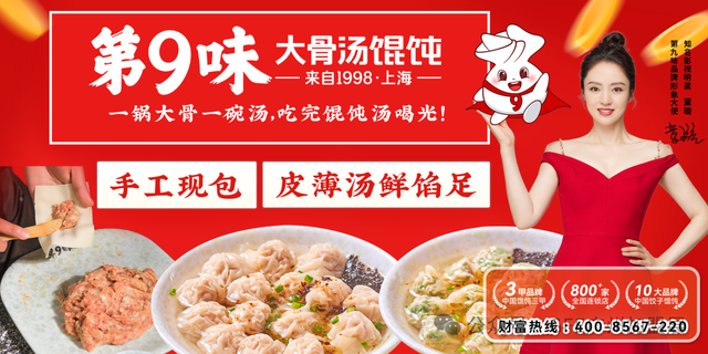 由知名影星董璇代言的第9味門店現已覆蓋廣東各地,全國門店800+。第9味是國內極少數至今采用木棍壓皮和每天用十幾種滋補草本熬制的骨頭湯的現包餛飩頭部品牌,產品豐富多元化,滿足多年齡層次消費需求,可全時段經營。第9味在廣州建有中央食品工廠和中央物流配送中心。2020年榮獲中國餛飩三家品牌;2021、2022、2023年連續3年榮獲中國餃子餛飩十大品牌;2020、2021、2022年獲得廣東商業特許經營百企;2022、2023年獲得廣東餐飲百強企業,是值得消費者信任的品牌。